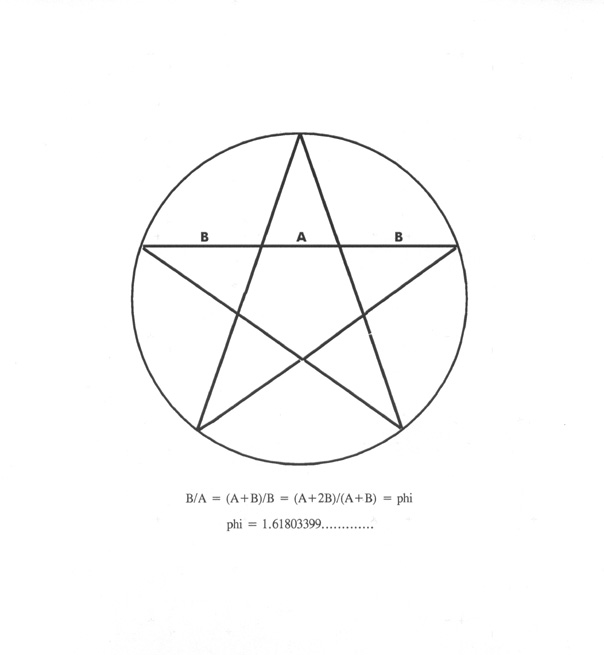 Each line in this symbol is divided into three parts. If we call the center part "A" and each outer part "B", then B divided by A is equal to 1.6180339, a number the Greeks later called "phi". The length A plus B, divided by B, also equals "phi". And the complete length of one line, A plus B plus B, divided by the length A plus B, also equals "phi". When "phi" is inverted, it equals .6180339, and when it is multiplied by itself, it equals 2.6180339. The Egyptians called "phi" the Golden Mean. And their priest-scientists knew that this was the number of the life force and that the pentagram was, therefore, the symbol of the life force. And a perfect pentagram is constructed by making A equal to 2 units in length, and B equal to 1 plus the square root of 5 in length.