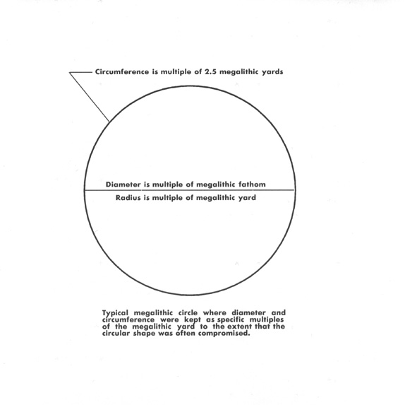 (5). All circle circumferences were multiples of 2.5 megalithic yards (MY), and usually of 12.5 MY. Most circles had diameters of 8 or 16 MY with a circumferences of 25 or 50 MY. Sometimes pi was used as 3 1/8, and sometimes as 22/7. Some circles were very accurately laid out and at other times, accuracy does not appear to have been necessary.