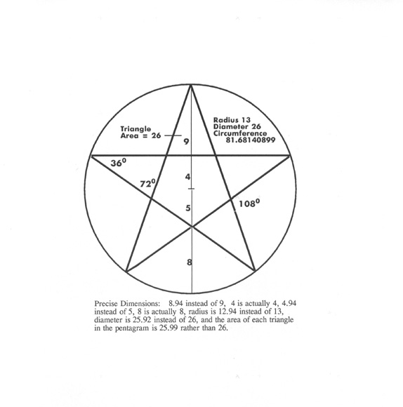 If we round off the almost numbers to whole numbers and circumscribe the pentagram with a circle, we have the numbers 9, 4, and 5, 8, and a circle with a radius of 13 and a diameter of 26. The area of each of the pentagram's triangles is 26 and the circumference of the circle is 81. Each line of the pentagram is 25 units long.